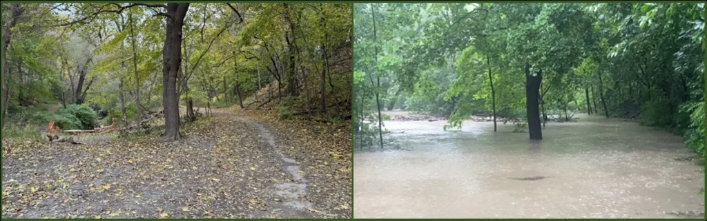 Area at south end of above-ground section of Yellow Creek. Left picture: November 2025; right picture: flooding of July 2024. (Photo credits: Tom Connell and Robin Miller)